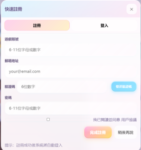 一、打開永恆服官網www.Toyhy.com 二、點擊快速注冊賬號 三、輸入想注冊的賬號及有效郵箱,點擊發送驗證碼,會有驗證碼發送到您的郵箱,填寫驗證碼,輸入密碼(盡量簡單一些比如123456)進入游戲會彈出窗口可更改密碼 四、點開游戲文件夾中如圖的圖標或桌面上的游戲 五、點擊開始游戲 六、輸入注冊時填寫的賬號及密碼,點擊上綫 七、彈出更改密碼的窗口(密碼不要大小寫組合在一起),填寫完畢點擊確認 八、創建人物 成功登入,如注冊時遇到問題可在游戲群内私聊小福,祝您游戲愉快~